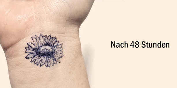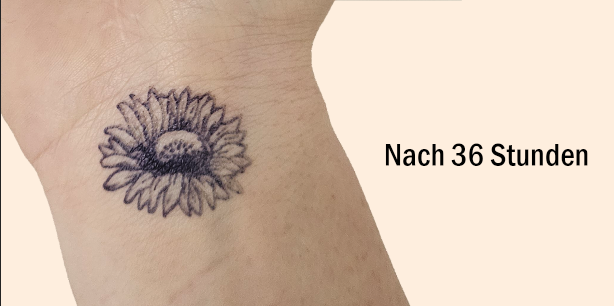 Das Papier mit Vorsicht entfernen, um das Tattoo nicht zu verschieben. Das Tattoo ist nun ganz leicht sichtbar. In den nächsten 36 Stunden entwickelt sich Dein Tattoo.